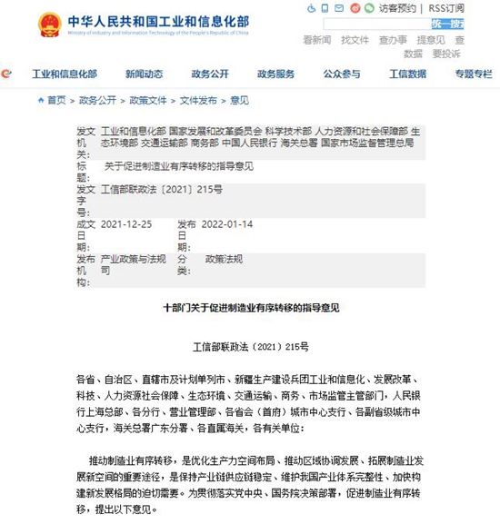 工信部等十部门联合发布意见 促进制造业有序转移