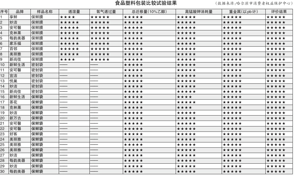 比较试验结果显示:30款食品塑料包装产品均达标