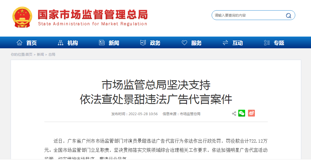 市场监管总局坚决支持依法查处景甜违法广告代言案件