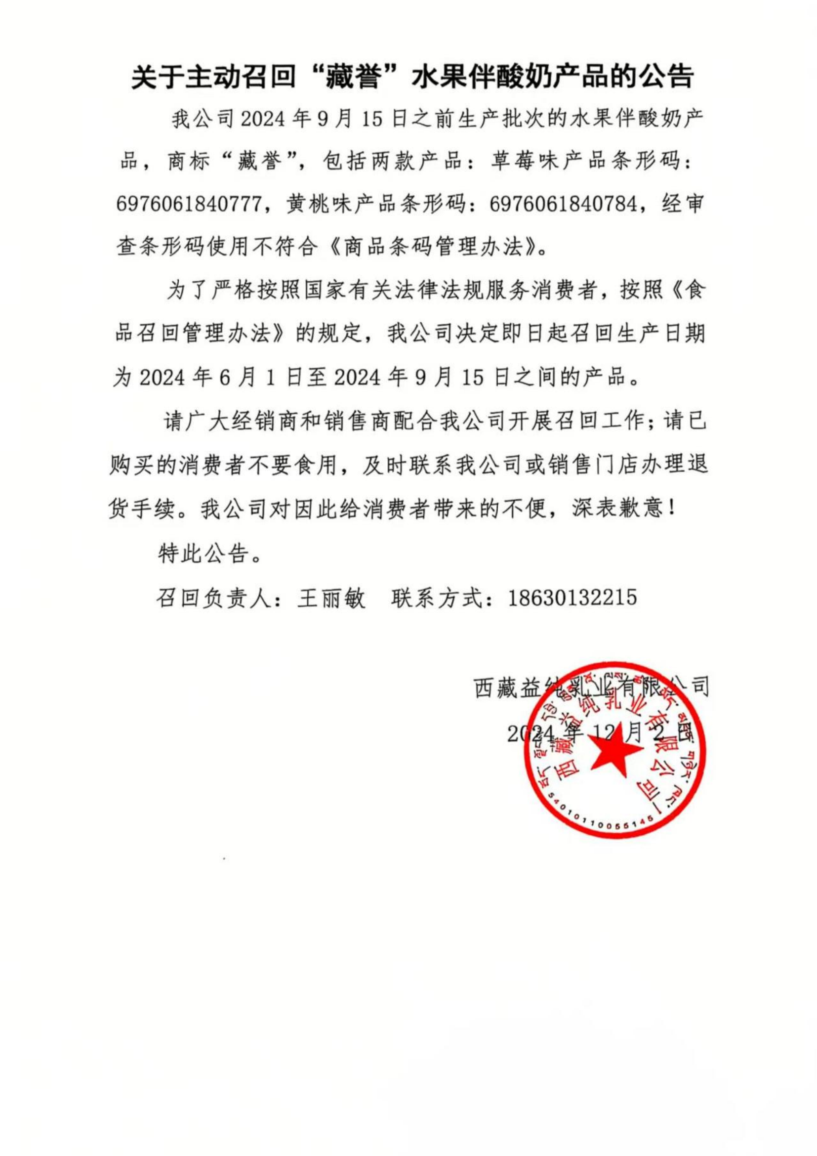 关于主动召回“藏誉”水果伴酸奶产品的公告
