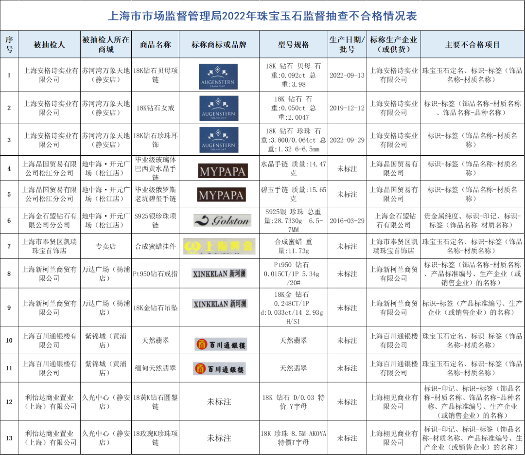 “上海黄金”、“安格诗”等13批次珠宝玉石抽检不合格