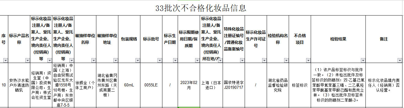 1批次安热沙防晒霜不合格资生堂否认经营