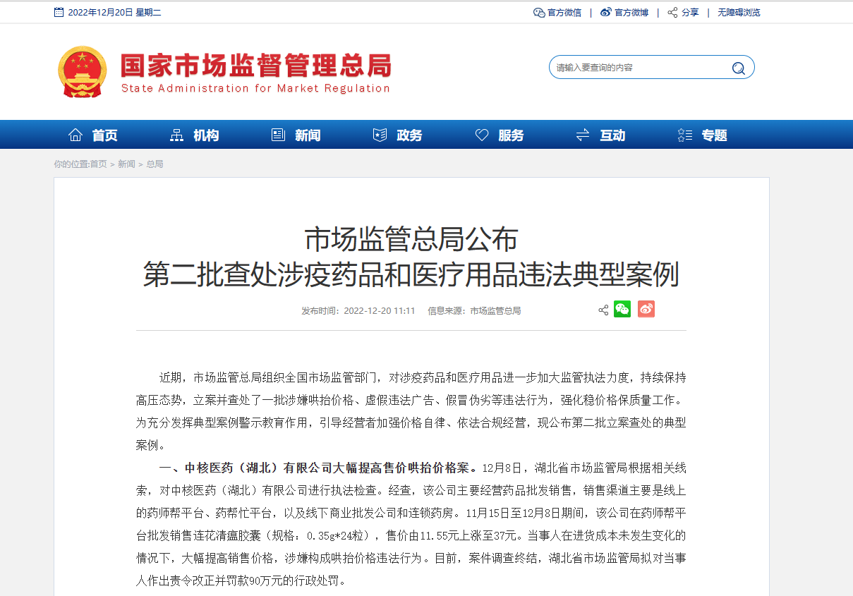 市场监管总局公布 第二批查处涉疫药品和医疗用品违法典型案例