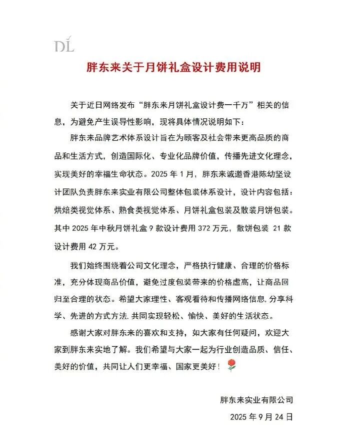 胖东来否认“月饼礼盒设计费一千万元”,称礼盒设计费372万元、散饼42万元