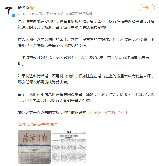 被特斯拉告了,大V拒不赔礼道歉,被强制执行!他粉丝量已翻10倍…