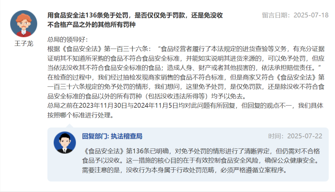 总局答复!《食品安全法》第136条免于处罚,是否仅仅免于罚款?