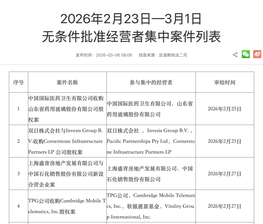 市场监管总局发布2月23日—3月1日无条件批准经营者集中案件列表