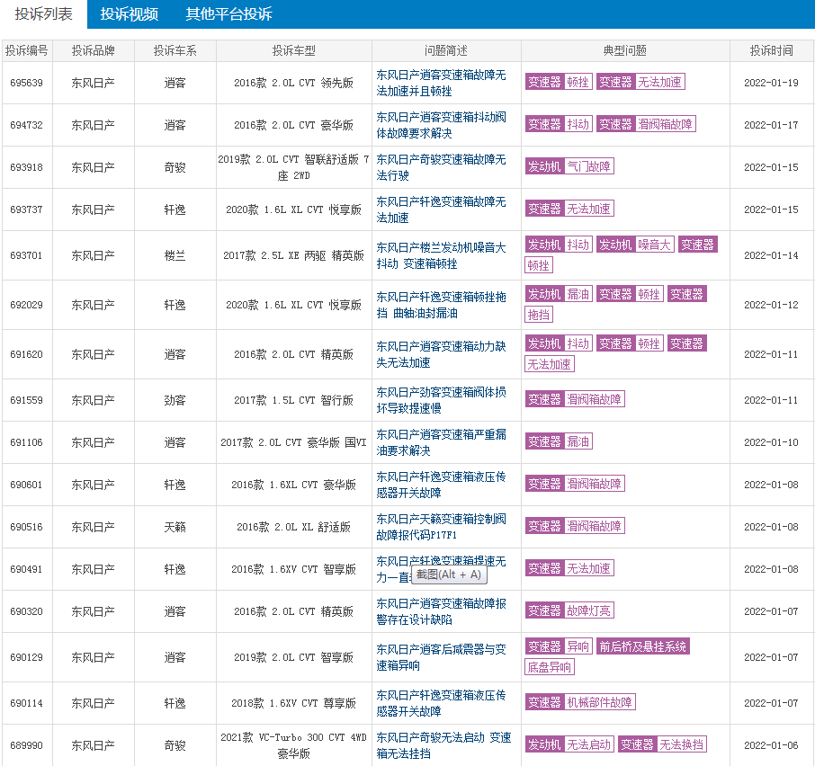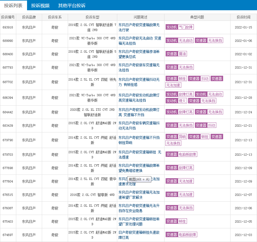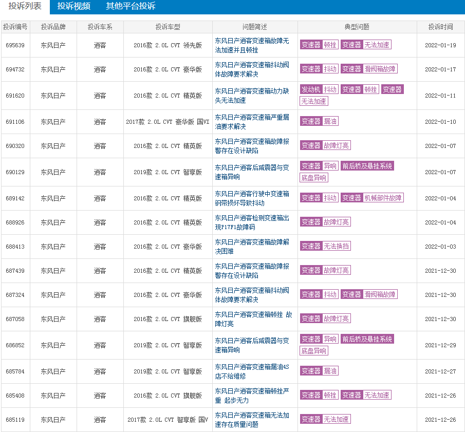 2022年1月6日,东风日产正式公布了2021年的销量成绩。伴随着12月获得终端销量114093辆,东风日产2021年度的销量也定格在了1134889辆,其中日产品牌的全年销量为1047073辆,连续7年销量突破百万关口。轩逸组合依然是东风日产最大的销量来源,2021年1-12月累计销量超过51万辆,其中12月的销量达到了50492辆,保住了中国汽车市场年度销量冠军的头衔。随着全新一代奇骏上市后表现疲软,逍客成为了日产SUV家族在2021年度的销量担当。根据官方数据显示,逍客在去年累计销量达到了161152辆,同比增长2.2%。根据乘联会的数据显示,奇骏在2021年前11个月累计销量为99133辆,因此它在2021年的累计销量应该会突破10万关口。 轩逸、奇骏、逍客这三款车型算是如今日产的顶梁柱,在销量上丝毫不差,轩逸每个月的销量都在冠军与亚军之间徘徊,逍客、奇骏也是SUV榜单的Top10常客,但是车主的投诉也从来没有少过,主要问题还是变速箱。 东风日产CVT变速箱的“喜”与“悲” 日系车最喜欢采用的变速箱就是CVT变速箱,这种类型的变速箱最大的特点就是省油,同时换挡平顺性极佳。然而当CVT这种以平顺性著称的变速箱被运用到日产的汽车上时,依然节能省油,但是在换挡就没有那么平顺了,顿挫、异响时常发生,甚至在极端情况之下还会出现脱档这种问题。 东风日产CVT变速箱“通病”持续爆发 东风日产CVT变速箱异响、顿挫质量问题多发,是东风日产目前面临的重要问题。从车质网数据来看,东风日产旗下轩逸、奇骏、逍客等因为质量问题多发,一直都是月度车型投诉榜上的常客。其中,日产轩逸因为变速箱异响、变速箱顿挫、空调问题、变速箱故障灯亮等问题多发,位居2021年合资车型投诉榜第4名。 由于变速箱无法加速、变速箱顿挫、变速箱故障灯亮、变速箱滑阀箱故障等质量问题多发,日产奇骏位居2021年合资车型投诉榜第10名。由于变速箱故障无法加速、变速箱漏油、变数箱异响、等质量问题多发,东风日产逍客2021年投诉量还是比较多。这3款车都是东风日产旗下的重磅车型。但是,这3款车质量问题均相对比较多发。其中,CVT变速箱成为重灾区,也一直在持续发酵。