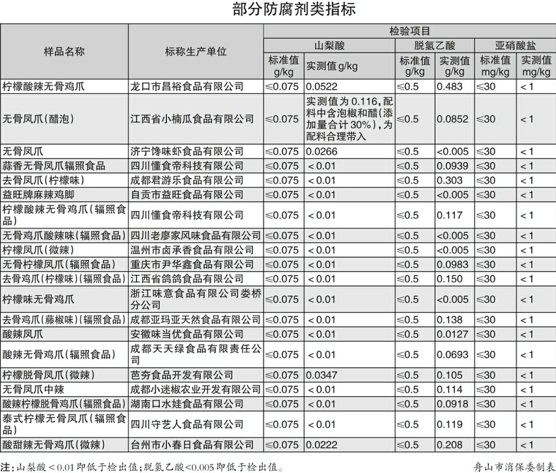 记者 郑铁峰 因食用方便、口味独特等特点,即食凤爪成为当下流行的网红小食品,深受消费者喜爱。目前,市场上凤爪类小食品种类和口味繁多,其品质是否过关、该如何选购与食用?为了让消费者对即食凤爪小食品的产品质量情况有更深入的了解,科学选购、食用即食凤爪,近期浙江省舟山市消保委委托舟山市食品药品检验检测研究院对即食凤爪食品进行了比较试验。 据了解,舟山市消保委工作人员模拟普通消费者在网购平台随机购买了20批次真空包装即食凤爪开展比较试验,样品产地主要集中在四川、山东、重庆、江西、安徽、浙江等区域,口味以酸辣、微辣、中辣为主。检测项目涉及微生物指标(菌落总数、大肠菌群、沙门氏菌、金黄色葡萄球菌)、食品添加剂指标(脱氢乙酸、苯甲酸、山梨酸、糖精钠、安赛蜜、胭脂红、柠檬黄、日落黄、诱惑红、亚硝酸盐)、违禁添加物(过氧化氢)三方面。 微生物指标均合格 微生物指标,可用于判定即食凤爪食品的卫生情况,消费者如果食用了微生物指标超标的食品,极易引起腹泻等肠道疾病。另外,沙门氏菌和金黄色葡萄球菌为条件性致病菌,沙门氏菌中毒的症状主要以急性肠胃炎为主,潜伏期一般为4h—48h,对人体危害较大。本次比较试验对样品的菌落总数、大肠菌群、沙门氏菌、金黄色葡萄球菌等微生物指标进行了检测。 结果显示,所有样品的微生物指标检测结果均符合GB2726-2005《熟肉制品卫生标准》、GB29921-2021《食品安全国家标准预包装食品中致病菌限量》等国家标准要求。 部分样品检出脱氢乙酸及山梨酸 脱氢乙酸(钠)、山梨酸(钾)和苯甲酸(钠)均是我国允许使用的防腐剂,安全性较高。在酸性条件下,上述防腐剂对霉菌、酵母和细菌具有显著的抑制作用,但人体长期过量摄入会抑制骨骼生长,危害肾、肝脏的健康。根据GB2760-2014《食品安全国家标准食品添加剂使用标准》规定,熟肉制品中山梨酸的最大允许使用量为0.075g/kg,脱氢乙酸的最大允许使用量为0.5g/kg,而苯甲酸(钠)则不允许在熟肉制品中使用。 试验结果显示,部分样品检出脱氢乙酸及山梨酸(钾),其中15批次检出脱氢乙酸,检测值范围在0.0127g/kg—0.483g/kg;4批次检出山梨酸(钾),检测值范围在0.0222g/kg—0.116g/kg,均符合GB2760-2014《食品安全国家标准食品添加剂使用标准》标准要求。20批次样品苯甲酸(钠)均未检出。 亚硝酸盐是一类无机化合物的总称,主要指亚硝酸钠,具有防腐性,可与肉品中的肌红素结合,常被添加在肉制品中作为护色剂,以维持良好的外观;其次,它可以防止肉毒梭状芽孢杆菌的产生,提高食用肉制品的安全性,但人体吸收过量亚硝酸盐会影响红细胞运作,严重的会造成脑部缺氧甚至死亡。亚硝酸盐本身并不致癌,但在烹调或其他条件下,肉品内的亚硝酸盐可与氨基酸降解反应,生成有强致癌性的亚硝胺。根据GB2760-2014《食品安全国家标准食品添加剂使用标准》规定,酱卤肉制品中亚硝酸盐的最大允许使用量为0.15g/kg(以亚硝酸钠计,残留量≤30mg/kg)。本次所有样品均未检出亚硝酸盐。 甜味剂、着色剂均未检出 糖精钠是食品工业中常用的合成甜味剂,甜度是蔗糖的300—500倍,在生物体内不被分解,人体摄入过多的糖精钠会影响肠胃消化酶的正常分泌,降低小肠的吸收能力,使食欲减退。 安赛蜜类似于糖精,甜度约为蔗糖的130倍,口感好、无热量,在人体内不代谢、不吸收,对热和酸稳定性好。经常食用合成甜味剂超标的食品,会对人体的肝脏和神经系统造成危害,短时间内大量食用,则会引起血小板减少导致急性大出血。根据GB2760-2014《食品安全国家标准食品添加剂使用标准》规定,糖精钠和安赛蜜不允许在熟肉制品中使用。本次所有样品均未检出糖精钠及安赛蜜。 为了使鸡爪呈现诱人色泽以吸引消费者,一些不法商贩可能会超范围使用着色剂使鸡爪色泽鲜亮。GB2760-2014《食品安全国家标准食品添加剂食用标准》规定,禁止向熟肉食品中添加各种着色剂。本次比较试验根据标准规定,对即食凤爪进行了多种常见着色剂的检测,所有样品均未检出。 消费提示 颜色太白 这样的凤爪可能被双氧水泡过 舟山市消保委表示,本次比较试验结果反映出网售即食凤爪小食品质量良莠不齐,部分产品存在违禁使用过氧化氢现象。一些不法商贩使用双氧水(有杀菌和漂白作用)浸泡产品以延长保质期,还可以让鸡爪变得又大又白,但食用这种鸡爪对人体健康影响很大。 如何识别被双氧水处理过的鸡爪?舟山市消保委提醒消费者,一看外观,正常凤爪颜色自然,呈微黄色,颜色太白则可能被双氧水浸泡过;二看骨关节,一般煮熟后的凤爪为深褐色,肉质纹理也有颜色;三看韧度,正常鸡爪煮熟后有一定韧性,不易撕下来;四看口感,正常的鸡爪吃起来有韧劲,而双氧水处理过的鸡爪口感很脆。 选即食凤爪 别忘看产品配料表 舟山市消保委提醒消费者,在购买和食用即食凤爪时应注意以下几点: 选择正规渠道购买。此次比较试验的样品均从大型网购平台购买,样品质量较有保障,消费者购买时一定要注意把握。同时,购买时要注意查看产品包装是否完整,包装上标示的产品生产日期、保质期、贮存条件、配料表、“QS”或“SC”标识、生产厂名、厂址、联系方式等内容是否齐全。 购买后注意保管。要按照包装标签标示的方法贮存,贮存时限不能超过产品保质期。食用前应注意观察包装