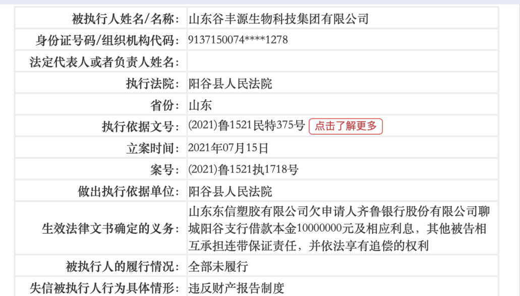 值得注意的是,谷丰源生物已经多次成为失信被执行人。中国执行信息公开网显示,山东东信塑胶有限公司欠齐鲁银行股份有限公司聊城阳谷支行借款本金1000万元及相应利息,谷丰源为其承担连带保证责任。由于违反财产报告制度,未执行偿还欠款的义务,谷丰源也在2021年7月15日被法院列为失信被执行人。 ![]()