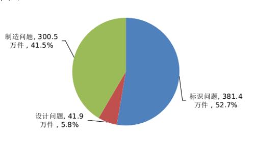 2021年消费品召回产品主要类别分布 从缺陷原因看,2021年因产品设计问题召回104次,涉及产品41.9万件;因制造问题召回415次,涉及产品300.5万件;因标识问题召回30次,涉及产品381.4万件。
