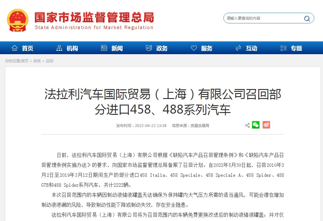 日前,法拉利汽车国际贸易(上海)有限公司根据《缺陷汽车产品召回管理条例》和《缺陷汽车产品召回管理条例实施办法》的要求,向国家市场监督管理总局备案了召回计划。自2022年5月30日起,召回2010年3月2日至2019年3月12日期间生产的部分进口458 Italia、458 Speciale、458 Speciale A、458 Spider、488 GTB和488 Spider系列汽车,共计2222辆。 本次召回范围内的车辆因制动液储液罐盖无法确保为保持罐内大气压力所需的适当通风,可能会潜在增加制动液泄漏的风险,导致制动性能下降或制动失效,存在安全隐患。 法拉利汽车国际贸易(上海)有限公司将为召回范围内的车辆免费更换改进后的制动液储液罐盖;并对仪表重新编程,更新制动液液位过低时的警示信息,以消除安全隐患。 应急处置措施:用户应谨慎驾驶车辆,如仪表出现制动液液位过低警告灯亮起,应立即安全停车,联系法拉利授权维修中心安排拖车将车辆拖回并免费检测维修。 法拉利汽车国际贸易(上海)有限公司将以挂号信等形式,通知相关车主召回事宜。用户可拨打法拉利汽车国际贸易(上海)有限公司热线:400-670-0828,了解此次召回的详细信息。此外,也可登录网站dpac.samr.gov.cn、www.recall.org.cn,关注微信公众号(SAMRDPAC),了解更多信息,反映缺陷线索。 |