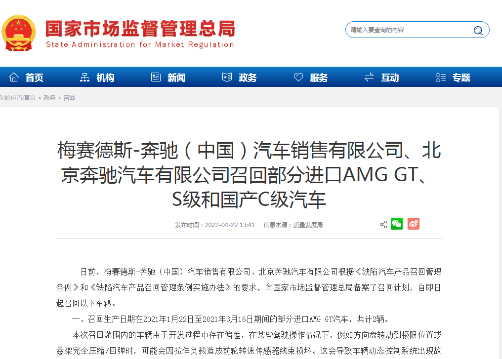 奔驰汽车召回部分进口AMG GT、S级和国产C级汽车