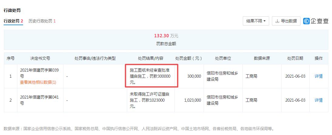2021年6月,信阳梁鸿置业有限公司因“施工图纸未经审查批准擅自施工”,被信阳市住房和城乡建设局罚款人民币30万元的处罚。