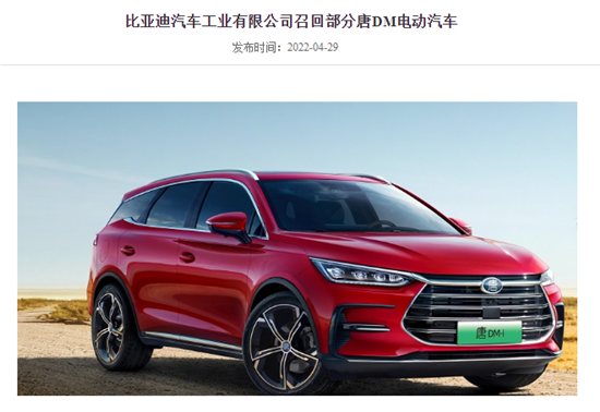 截图自国家市场监督管理总局缺陷产品管理中心网站 此外,比亚迪决定自2022年4月29日起,召回2021年9月2日至2022年3月14日生产的部分唐DM车型电动汽车,共计9663辆。 本次召回范围内部分车辆的动力电池包托盘由于制造原因,托盘透气阀安装面不平整,有进水风险。这可能造成动力电池系统电气回路故障,极端情况下有引起动力电池热失控的风险,存在安全隐患。 比亚迪汽车工业有限公司将委托授权经销商为召回范围内的车辆进行检查,若电池包存在漏电或托盘透气阀安装面不平整,则免费更换电池包,以消除安全隐患。