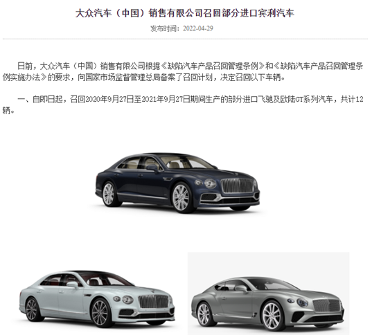 截图自国家市场监督管理总局缺陷产品管理中心网站 最后,大众汽车(中国)决定自即日起,召回2020年9月27日至2021年9月27日期间生产的部分进口飞驰及欧陆GT系列汽车,共计12辆。 本次召回范围内的车辆前排座椅安装了不符合设计要求的安全带总成,其中前排乘员座椅安全带总成可能未按设计要求配备自锁式卷收器(ALR),会导致儿童座椅无法被正确约束,车辆发生碰撞事故时会增加乘员受伤的风险,存在安全隐患。 召回维修前,请勿将儿童座椅安装在前排座椅上,需要使用儿童座椅时可将其安装在后排座椅上。 大众汽车(中国)销售有限公司宾利品牌将通过授权经销商,为召回范围内的车辆免费检查前排座椅安全带总成,并根据需要更换为符合设计要求的安全带总成,以消除安全隐患。 大众汽车(中国)还宣布自2022年5月11日起,召回2020年8月3日至2022年2月10日期间生产的部分进口添越系列汽车,共计2630辆。 本次召回范围内的部分车辆由于生产过程中装配不当,后排座椅可能未被正确锁定到座椅导轨中。车辆发生碰撞事故时,后排座椅可能移动或变形,会增加相关乘员受伤的风险,存在安全隐患。 大众汽车(中国)销售有限公司宾利品牌将通过授权经销商,为召回范围内的车辆免费检查及调整后排座椅的安装,并在座椅内侧加装两个导轨限位器,以消除安全隐患。