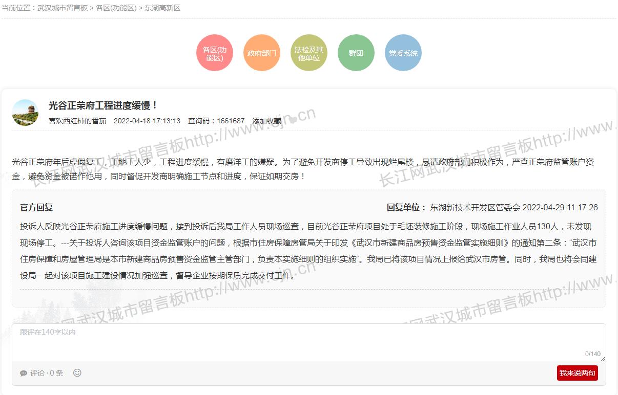 年后以来,国家在原有的房地产行业金融政策上陆续松绑,各地政府推出各种激励政策,但是市场依然寒冬。近一段时间,因自身问题停工的各大房企陆续宣布复工,中国质量报告作为市场监管系统的质量监督媒体,中国质量报告品质地产专栏调查组赴全国各地探访停工复工情况,深入一线调查消费者反映的停工项目实际情况,如实的将实地调查情况跟踪报道,给予消费者真实反馈。中国质量报告品质地产专栏接到多起关于正荣全国项目停工消息,各网络自媒体也有相继报道。早在2月份,正荣地产股票突遭变故至今三个月里,涉及正荣全国数十个项目接连出现停工或者转让消息,让这家民企陷入深渊。债务接连违约后,正荣宣布自救方案,稳定项目生产,争取尽快释放受限资金,同时争取转让部分项目来改善资金流动性,最后调整组织架构,战略上以‘保交付、保供货,保品质、促销售、促回款’为五大核心目标。 这次品质地产调查组来到正荣地产武汉项目中的正荣紫阙台和光谷正荣府(正荣恒瑞御峯)。首先调查人员来到位于南湖大道软件园附近的正荣紫阙台项目,通过实地探访我们发现,项目入口有几十位工人陆续进场,门口保安人员严格按照防疫管理要求对进入工地的工人进行测温检查健康码,在调查人员探访的十几分钟里,几辆重型车辆进入项目工地运送材料。项目施工热火朝天,不存在停工情况。 ![]() ![]() ![]() ![]()