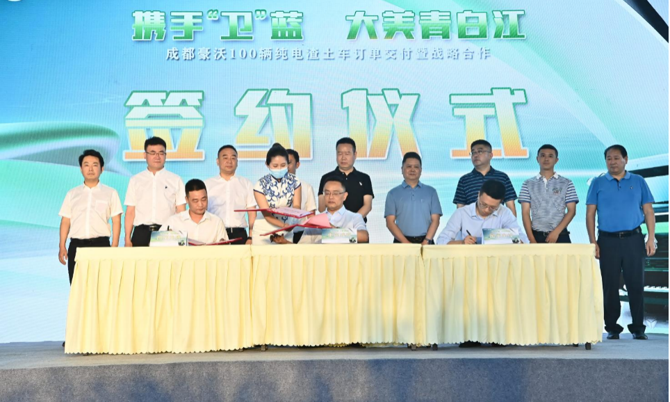 100辆成都豪沃纯电动渣土车正式入驻龙腾集团公司,将为打响蓝天保卫战做出新的贡献。随后,重汽成商、龙腾集团公司、国家电投启源芯动力三方签订战略合作协议,将共同沿着新能源“建圈强链”的发展之路阔步前行。