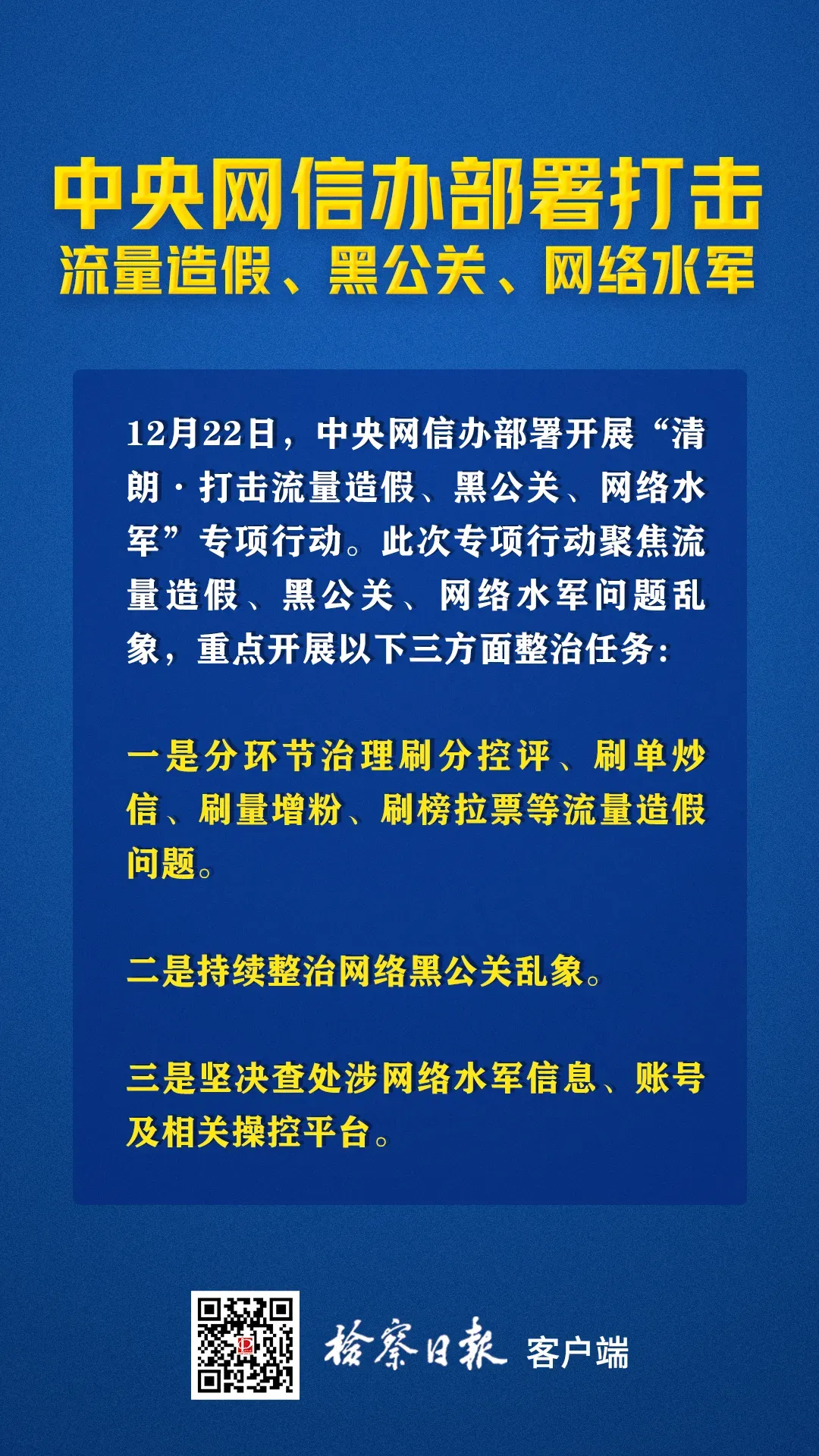 2021年12月,中央网信办部署开展“清朗•打击流量造假、黑公关、网络水军”专项行动,将雇佣专业写手和网络水军虚构“种草笔记”“网红测评”列为重点整治对象,治理制造虚假销量、虚假好评等问题;整治批量购买粉丝、增加“僵尸粉”“达人粉”,组织水军制造虚假阅读量、评论量、转发量、点赞量、下载量、曝光量等问题。全面清理一批打着“网络兼职”“招募写手”名义推广引流或招募水军的信息。要让网红探店行为受到平台规则及相关法律法规的有效约束,不能任其游走在监管之外。 |