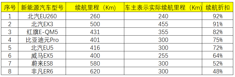 图为采访比亚迪元Pro车主 “续航里程缩水”依旧是新能源车的痛点 说到新能源汽车,续航问题是许多消费者在意的主要原因,由于新能源汽车电池的局限性,其续航里程更适合在市区内代步使用,不适合长途出行。 《产品可靠性报告》将采访中涉及到的车型续航里程进行了梳理,通过车主的反馈可以看出:虽然市面上不少新能源汽车厂商都打出了“超长续航”的广告,但消费者购车后却发现续航里程往往都会缩水,有的甚至只有标称里程的一半。