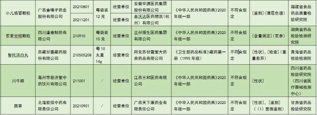 《通告》显示,经黑龙江省药品检验研究院检验,标示为福元药业有限公司生产的1批次阿达帕林凝胶不符合规定,不符合规定项目为pH值。经云南省食品药品监督检验研究院检验,标示为荣康集团广西康世缘制药有限公司生产的1批次川贝止咳糖浆不符合规定,不符合规定项目为装量。经广西壮族自治区食品药品检验所检验,标示为江西山高制药有限公司生产的1批次冠脉宁胶囊不符合规定,不符合规定项目为鉴别;标示为山东昊福药业集团制药有限公司生产的1批次冠脉宁片(素片)不符合规定,不符合规定项目为重量差异。经福建省食品药品质量检验研究院检验,标示为广西金嗓子药业股份有限公司生产的2批次小儿感冒颗粒不符合规定,不符合规定项目为鉴别。经湖南省药品检验检测研究院检验,标示为四川逢春制药有限公司生产的1批次玄麦甘桔颗粒不符合规定,不符合规定项目为含量测定。经青海省药品检验检测院检验,标示为西藏甘露藏药股份有限公司生产的1批次智托洁白丸不符合规定,不符合规定项目为性状、重量差异。经四川省药品检验研究院(四川省医疗器械检测中心)检验,标示为亳州市慈济堂中药饮片有限公司生产的1批次川牛膝不符合规定,不符合规定项目为性状。经甘肃省药品检验研究院检验,标示为北海能信中药有限责任公司生产的1批次茜草不符合规定,不符合规定项目为性状、鉴别。《通告》要求,对上述不符合规定药品,药品监督管理部门已要求相关企业和单位采取暂停销售使用、召回等风险控制措施,对不符合规定原因开展调查并切实进行整改。国家药品监督管理局要求相关省级药品监督管理部门依据《中华人民共和国药品管理法》,组织对上述企业和单位存在的涉嫌违法行为立案调查,并按规定公开查处结果。 |