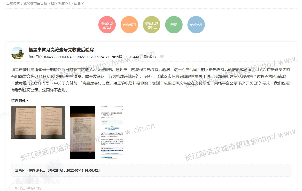 业主在城市留言板反映的问题如下: