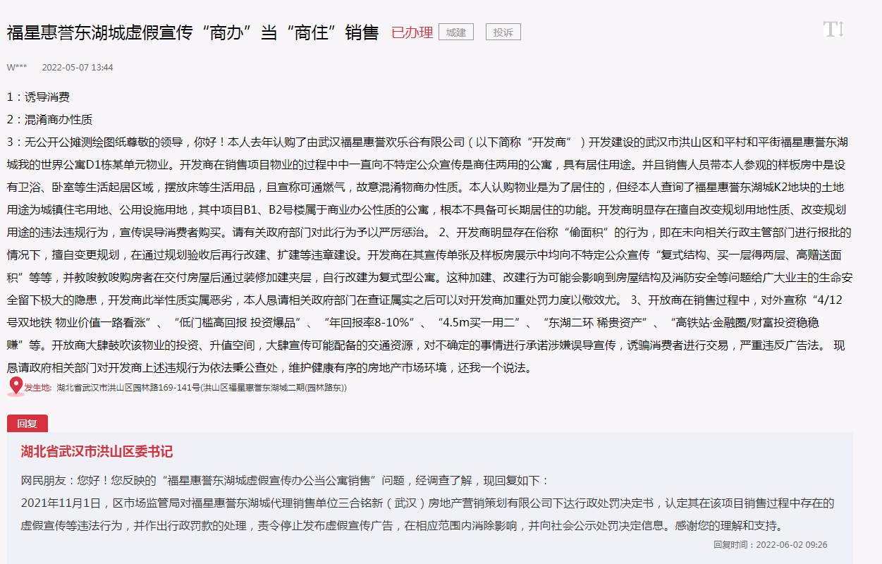 有业主反映,此次福星惠誉月亮湾壹号的这种疑似虚假宣传,商业欺诈行为,也并不是福星惠誉地产第一次“越线操作”,在之前的福星惠誉东湖城项目也被投诉项目销售时对外虚假宣传“商办”当“商住”销售,其宣传程度只有用夸张来形容,对外宣称“4/12号双地铁 物业价值一路看涨”、“低门槛高回报 投资爆品”、“年回报率8-10%”、“4.5m买一用二”、“东湖二环 稀贵资产”、“高铁站·金融圈/财富投资稳稳赚”等,这些没有任何事实依据的宣传,事后也受到相关部门处罚。 ![]()