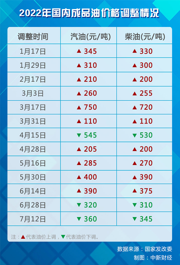 2022年国内成品油历次价格调整情况。(数据来源:国家发改委) 下一轮国内成品油调价窗口将在7月26日24时开启。 隆众资讯分析师李彦预测,以当前的国际原油价格水平计算,下一轮成品油调价开局将呈现下行的趋势。目前来看,虽然供应趋紧预期仍在,但美联储本月或将再度加息,市场对经济和需求的担忧延续,预计下一轮成品油调价下调的概率较大。 马建彩亦持相似观点,“当前国际市场供需博弈持续,短期内价格走势波动加剧,新一轮成品油零售价‘三连跌’概率较大。”(完)