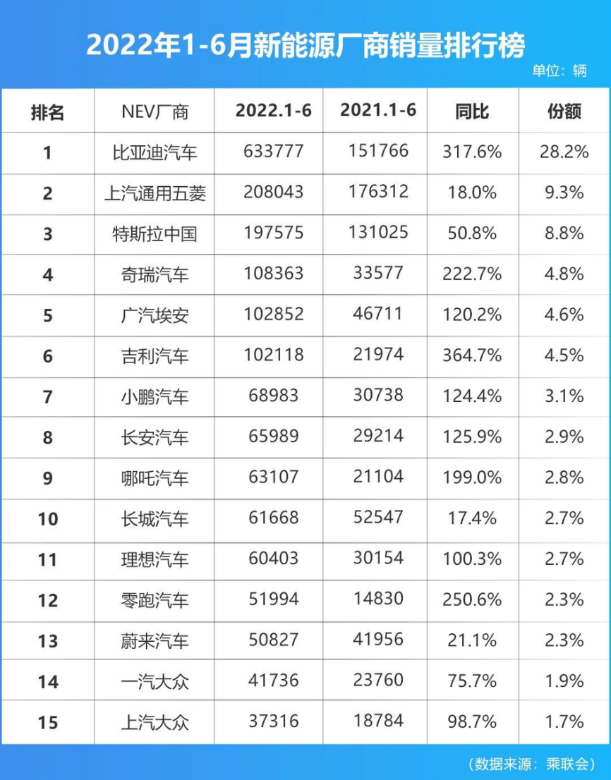 相比自主品牌新能源,合资品牌的新能源汽车销量似乎有些拿不出手。根据数据显示,唯一能够上榜的两个合资品牌也就只有一汽-大众和上汽大众,上半年销量数据分别为41736辆和37316辆。 与德系车企在电动化方面起步较慢有所不同,日系车企早已启动电动化,但丰田、本田等日系车企主要朝混合动力车型(HEV)发力,在纯电动车赛道上反而成为晚到者。 随着国内纯电动车的赛道越来越拥挤,新产品和新技术层出不穷,留给丰田等传统跨国车企争取出线的时间已不多了。 目前来看,重度依赖燃油车的合资品牌普遍比自主品牌承受更大的压力,亟待把新能源车短板补齐。中国汽车工业协会副总工程师许海东认为,今年将是汽车行业加快重组的一年,尤其是新能源汽车领域,也将迎来激烈的淘汰赛。 全国乘联会秘书长崔东树表示,合资品牌新能源市场表现不佳还与市场环境有关。在A级和B级新能源市场,合资品牌布局的车型相对较少,尤其是小型电动车市场是目前新能源的主力市场,这也是合资品牌不擅长的领域。 此外,在崔东树看来,合资品牌在燃油车领域的积累比较深厚,而欧美电动汽车产业链相对匮乏,所以导致合资品牌电动化产品竞争力也相对较弱。小型车不擅长、中高端车型电动化也不出色,这样一来,特斯拉和自主品牌便优于合资品牌,率先在新能源市场形成了独特优势,类似于手机市场中的小米、OPPO、VIVO与苹果的关系。 数据显示,在2021年,中国占世界新能源汽车比例为52%。截止到2022年5月,中国新能源汽车销量能达到占比全球销量59%的高位,主要原因中国的新能源需求强烈,形成较强的内生增长动力,带动了全球新能源汽车增量扩张。 随着新能源汽车对燃油车的替代效应逐步显现,下半年汽车供应链逐渐好转以及系列新能源汽车消费政策的刺激,新能源汽车销量有望继续攀升。汽车电动化的浪潮也将推动新一轮的科技和产业变革,新能源汽车市场逐渐走向成熟期。中国开始变为驱动世界新能源发展的核心力量。 2022年上半年汽车行业政策盘点 上半年,在经历年初短暂的开门红后,中国车市在多点疫情暴发、芯片供应不足、燃油价格上涨等多重不利因素的影响下,步入低潮。 得益于政策方面利好频出以及保供措施见效,6月份国内乘用车市场零售量时隔三个月首次恢复同比正增长。与此同时,全国汽车生产能力有望得到充分释放,因此,下半年车市也将更值得被看好。 提升电动汽车充电基础设施服务保障 2022年1月10日,国家发展改革委、国家能源局等多部门联合印发了《国家发展改革委等部门关于进一步提升电动汽车充电基础设施服务保障能力的实施意见》(发改能源规〔2022〕53号)(以下简称“《实施意见》”),对于指导“十四五”时期充电基础设施发展具有重要意义。《实施意见》明确了充电基础设施发展目标,针对当前突出问题提出解决方案,针对行业高质量发展提出措施要求。截至2021年底,全国充电设施规模达到261.7万台,换电站1298座,服务近800万辆新能源汽车,为我国新能源汽车产业发展提供了有力支撑。 “蓝牌”新规正式落地 2022年1月12日,工信部发布了《关于进一步加强轻型货车、小微型载客汽车生产和登记管理工作》的通知。新规自2022年3月1日起实施。至此,蓝牌轻卡“大吨小标”问题总算得到了解决,卡友们非常关心的各类问题都有了答案。 蓝牌轻卡新规的落地执行,是上半年卡车圈一件极其重要的大事件。其意义在于,一是进一步巩固车辆非法改装专项整治成果;二是从产品源头有效消除轻型货车“大吨小标”、压缩小微型载客汽车非法改装空间;三是压实各方责任,形成生产和登记环节闭环管理。此举或将结束轻卡市场多年“随意超载、无序竞争”的乱象。 《氢能产业发展中长期规划(2021—2035年)》发布 2022年3月23日,国家发展改革委、国家能源局联合研究制定的《氢能产业发展中长期规划(2021—2035年)》对外发布。根据《规划》,“十四五”时期,我国将初步建立以工业副产氢和可再生能源制氢就近利用为主的氢能供应体系;燃料电池车辆保有量约5万辆,部署建设一批加氢站,可再生能源制氢量达到10万—20万吨/年,实现二氧化碳减排100万—200万吨/年。 氢能是未来国家能源体系的重要组成部分,是用能终端实现绿色低碳发展的重要载体,也是战略性新兴产业的重点发展方向。氢能产业技术密集、覆盖面广、带动效益强,对减少二氧化碳等温室气体排放、实现碳达峰碳中和目标具有重要意义,也将为我国经济高质量发展注入新动能。《规划》的发布,明确了我国近期的燃料电池汽车发展目标,对促进燃料电池商用车特别是氢能中重卡的发展非常利好。 《关于进一步释放消费潜力促进消费持续恢复的意见》 2022年4月25日,国务院办公厅发布了《关于进一步释放消费潜力促进消费持续恢复的意见》(下称“意见”),《意见》指出,有序破除一些重点服务消费领域的体制机制障碍和隐性壁垒。稳定增加汽车等大宗消费,各地区不得新增汽车限购措施,已实施限购的地区逐步增加汽车增量指标数量、放宽购车人员资格限制,鼓励除个别超大城市外的限购地区实施城区、郊区指标差异化政策,更多通过法律、经济和科技手段调节汽车使用,因地制宜逐步取消汽车限购,推动汽车等消费品由购买管理向使用管理转变。 四部门联合发布《关于开展2022新