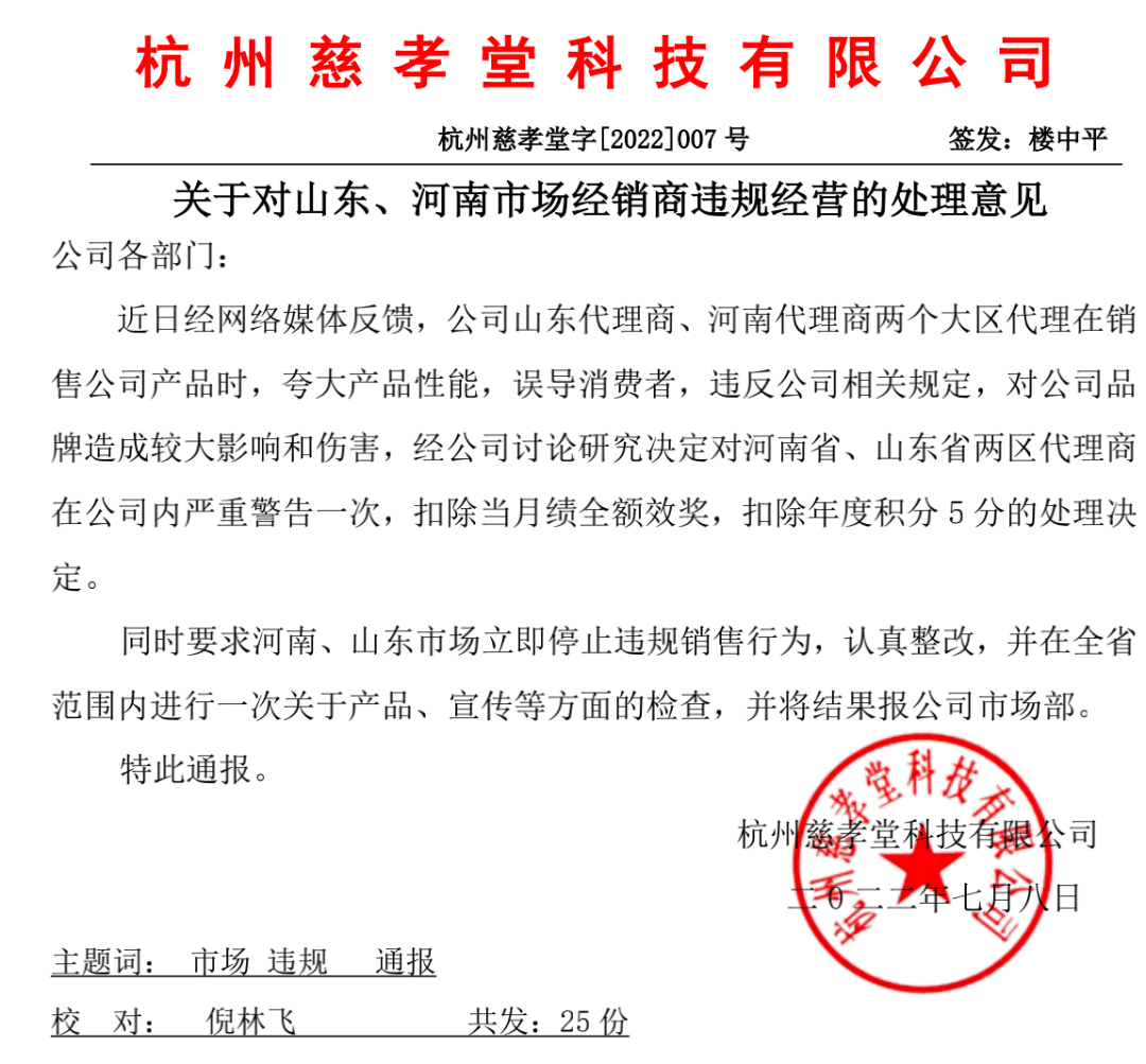 近日,《产品可靠性报告》杂志刊发杭州慈孝堂系列调查报道,就其所谓“磁疗”涉嫌虚假宣传,针对老年人进行洗脑式会销等涉嫌违规情况进行了披露。文章刊发后,引起社会广泛关注。连日来,全国各地的消费者、慈孝堂公司合作方包括慈孝堂门店前店长等,纷纷通过电话,短信等方式和本刊联系,揭露、谴责慈孝堂公司多种涉嫌欺诈的行为。 7月10日,杭州慈孝堂科技公司给本刊发来书面《整改整顿报告》、相关代理商处罚通知等函件。