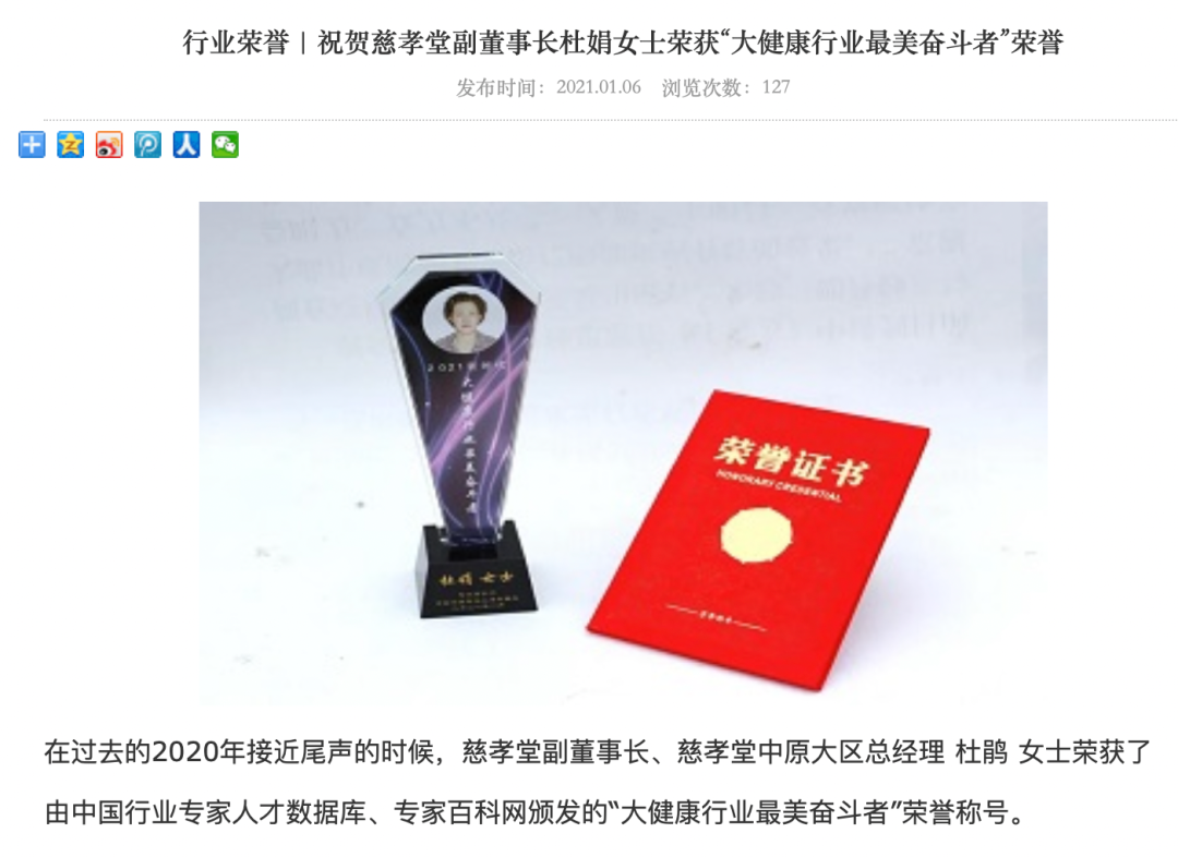 在2021年1月6日慈孝堂公司官网刊发《行业荣誉 | 祝贺慈孝堂副董事长杜娟女士荣获“大健康行业最美奋斗者”荣誉》文章中,杜娟的职务是慈孝堂副董事长、慈孝堂中原大区总经理。