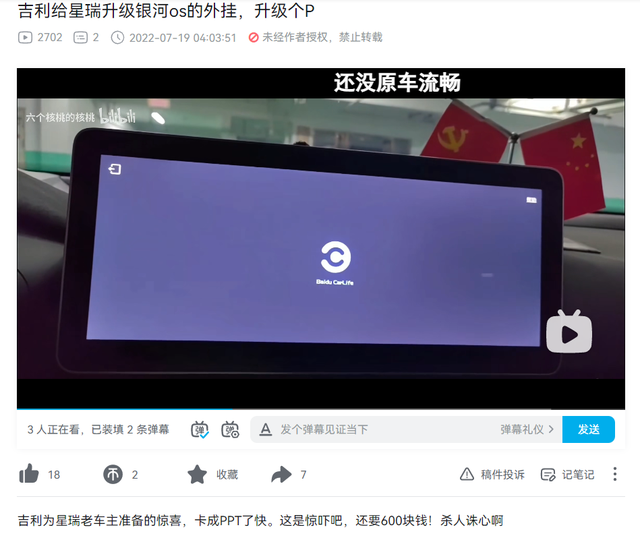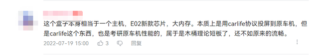 ![]() 图片来源:哔哩哔哩 据评论区网友分析,虽然“吉利星瑞银河精灵”有独立的芯片,也加大了内置存储,但本质上还是通过Carlife协议将新系统“投射”到原车机的屏幕上,替代、接管了原车的车机功能;由于Carlife功能的特性,也需要调用原车的芯片,所以原车羸弱的芯片性能反而成为了吉利星瑞银河精灵的短板,拖慢了开机速度。