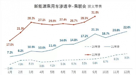 里程碑事件 新能源车零售渗透率突破30% 今年1-9月份,新能源汽车市场继续维持高景气度,产销量再创新高。其中,9月份新能源乘用车零售渗透率更是首次超过30%,达到31.8%,较去年同期提升11个百分点。成为行业发展史上的标志性事件。