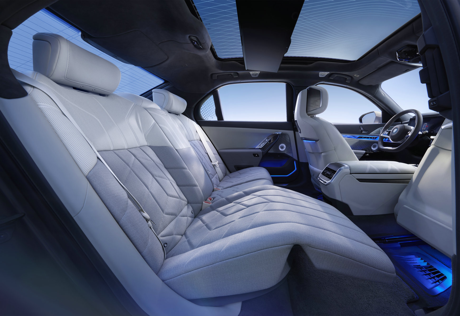 它被誉为“电动时代的旗舰”,还源自电驱系统与宝马造车精髓的完美结合。超薄的动力电池布置于车辆底板下方,电芯高度仅110毫米,净容量却高达101.7千瓦·时。新车还搭载了进一步升级的魔毯智能空气悬挂系统,其最大的亮点是首次应用于BMW车型的主动舒适防倾功能,可主动调整车辆倾斜一侧的车身高度。悬挂系统还配备电子防倾杆,打破了常规防倾杆硬连接结构,可以更灵活地调整由车轮跳动导致的车身振动,配合整体主动转向系统,有效提升高速变道和过弯时的平稳性及安全性。这部大型豪华车行驶起来就如小车般稳定和矫健。