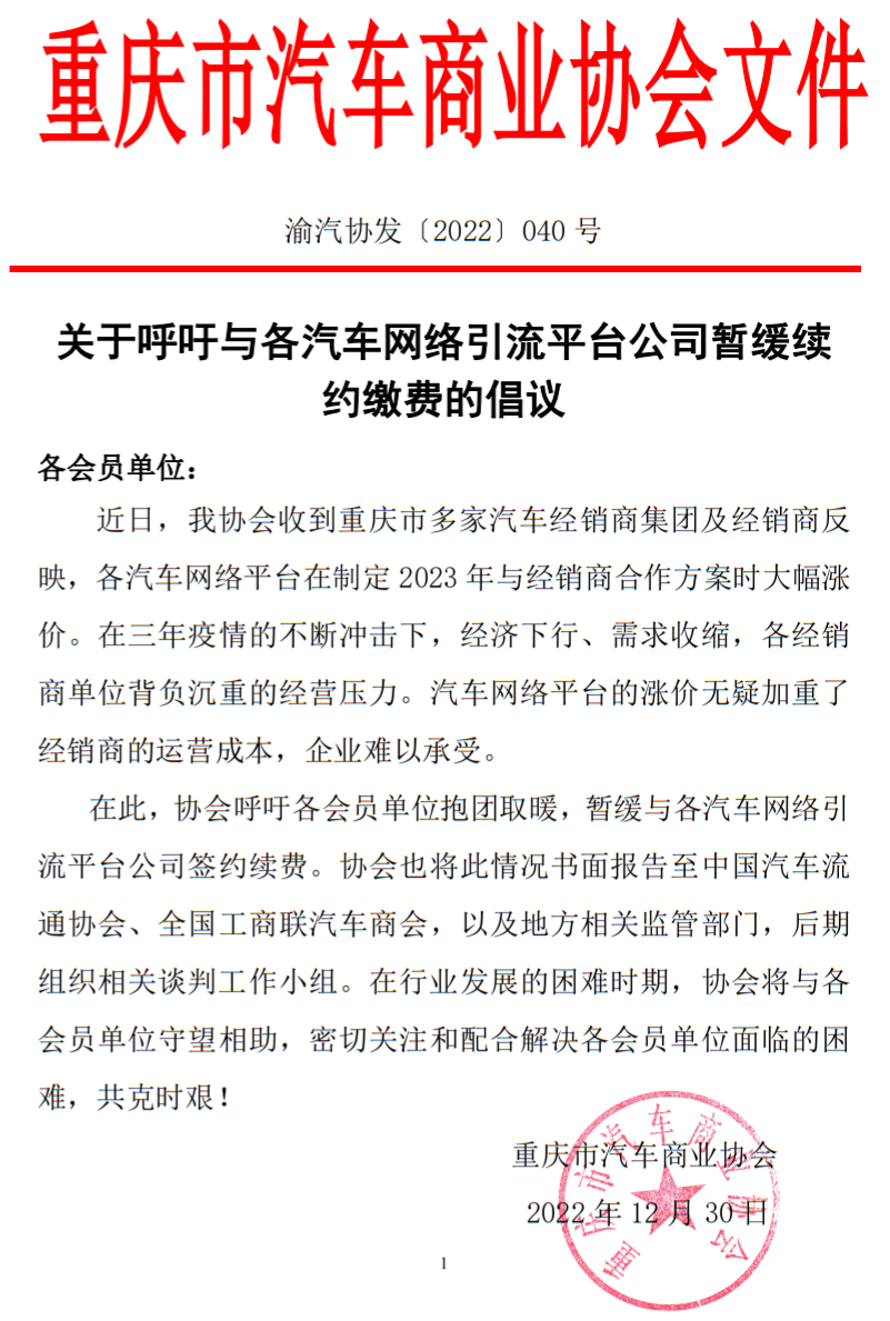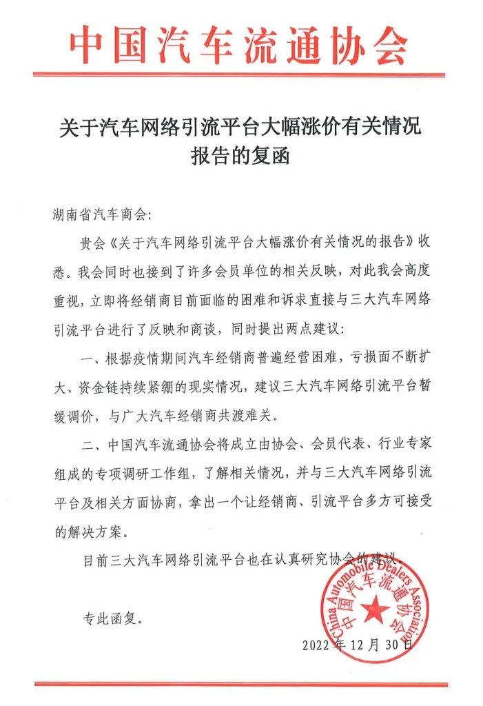 近日,中国汽车流通协会发布《关于汽车网络引流平台大幅涨价有关情况报告的复函》:我会收到湖南省汽车商会《关于汽车网络引流平台大幅涨价有关情况报告》,及相关会员单位的反映,对此我会高度重视,立即将经销商目前面临的困难和诉求直接与三大汽车网络引流平台进行了反映和商谈。