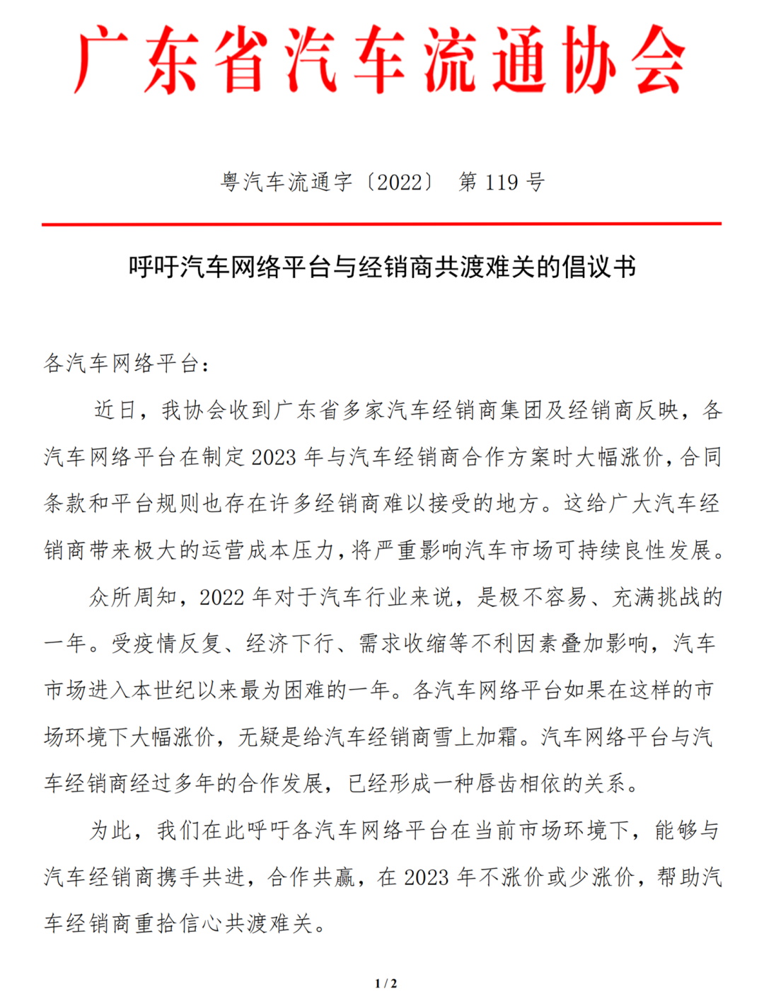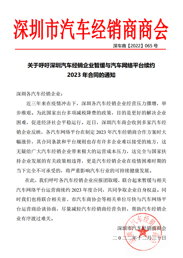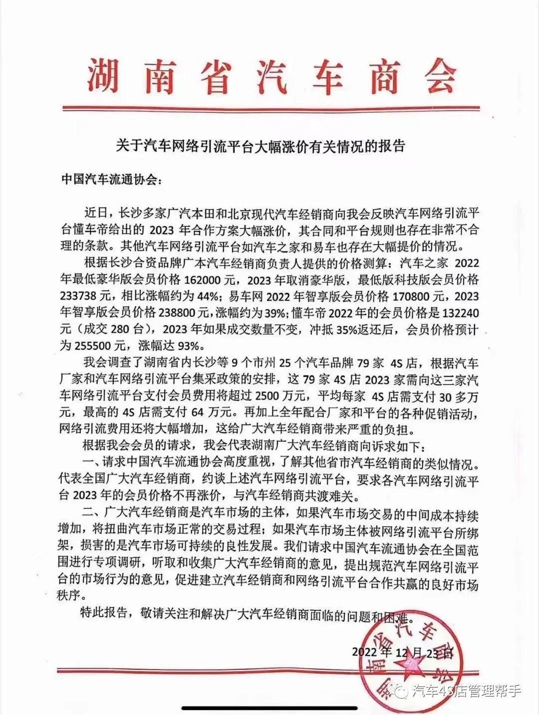 据一份由湖南省汽车商会出具的红头文件显示,湖南省汽车商会向中国汽车流通协会报告了2023年汽车网络引流平台对汽车经销商收取会员费涨价一事。据披露,长沙多家广汽本田和北京现代汽车经销商反映汽车网络引流平台给出的2023年合作方案大幅涨价,其合同和平台规则也存在非常不合理的条款。