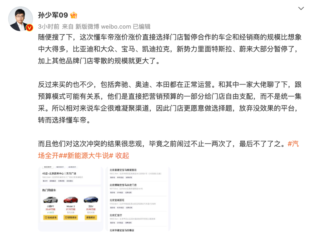 所谓CPT模式,是Cost Per Time的英文首字母缩写,即厂商及经销商按使用时长或使用周期(一般按1年计)来支付线索费用,这是当前汽车垂直媒体和车企合作的主流方式。在懂某帝看来,CPT模式下,目前行业内“线索繁荣”,但泡沫化严重,没有有效拉动销量,或者说增长速度是不匹配的。于是,懂某帝在成都车展期间推出了CPS(按照每单成功的交易付费)交易解决方案,懂车帝希望切换到CPS模式后,能够给汽车品牌和经销商带来真实高效的成交转化,实现交易成本的精准度量。 据汽车博主透露,此次懂车帝涨价直接选择门店涨停合作的车企和经销商规模比想象中大得多,比亚迪、大众、宝马、凯迪拉克以及新势力特斯拉、蔚来大部分涨停。