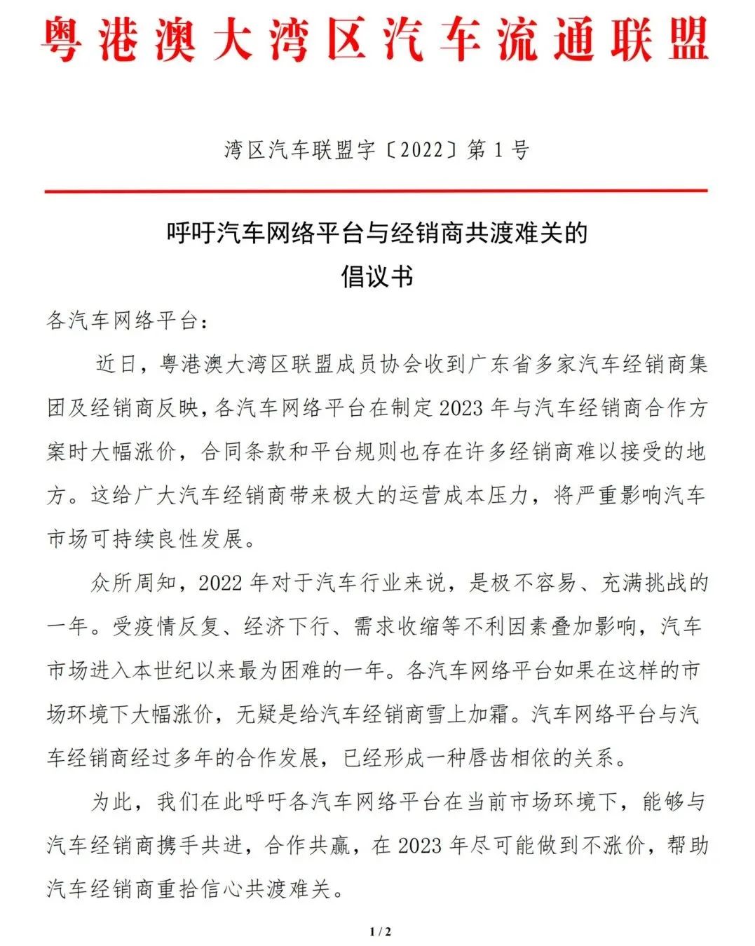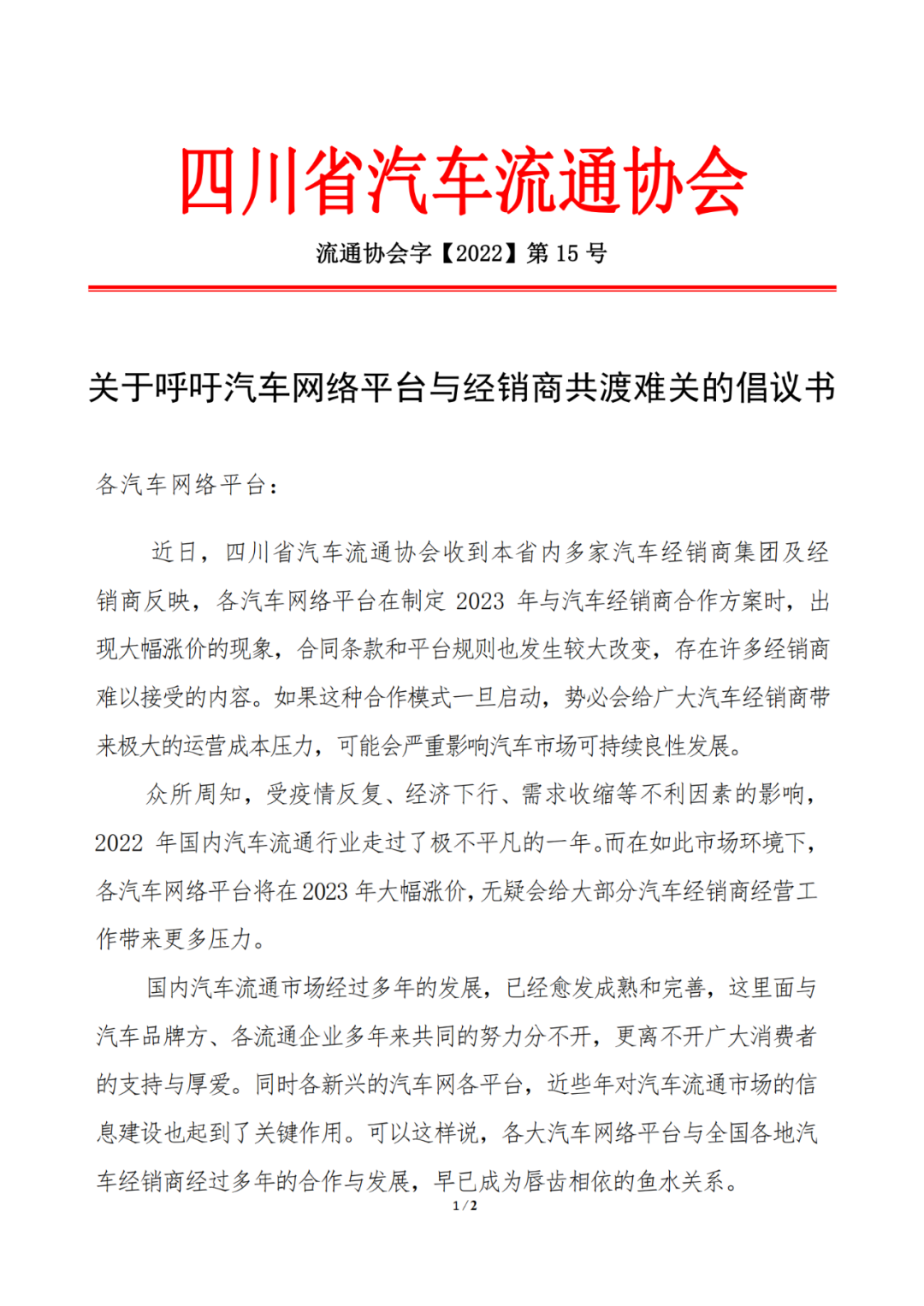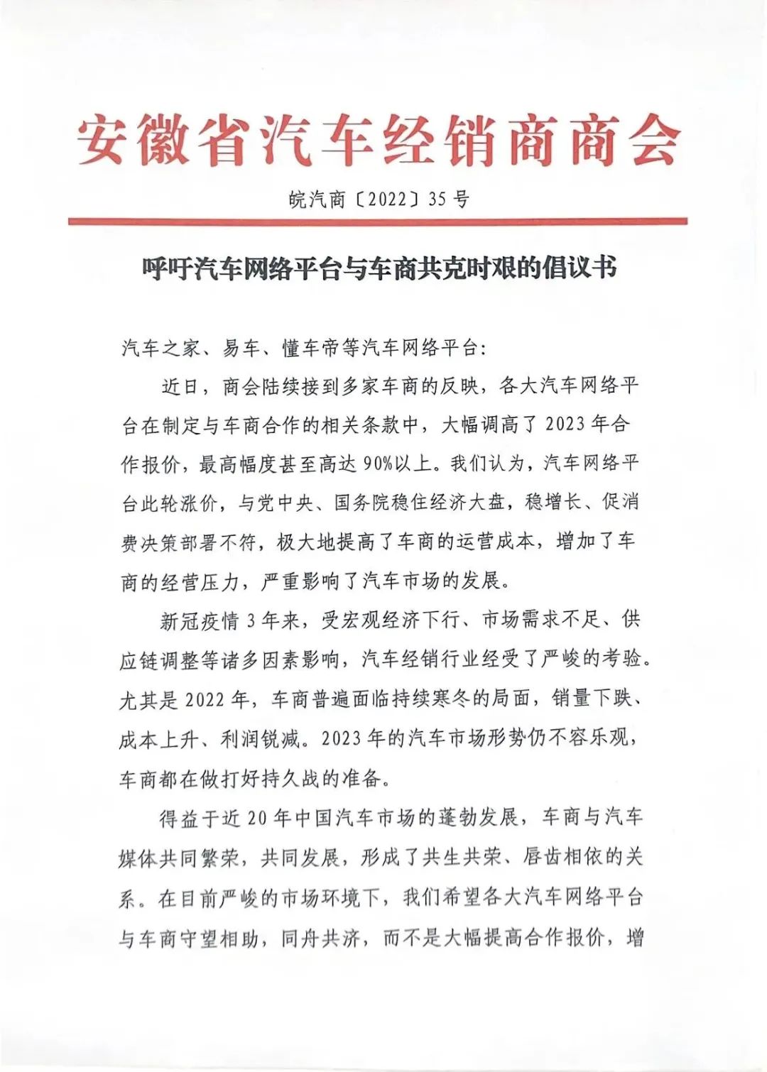 为了抵制会员费涨价,全国多省市汽车流通协会、经销商商会发布文件,呼吁会员单位与各汽车平台运营商暂缓续约,同时希望各大网络引流平台能够与车商守望相助,同舟共济,而不是大幅提升合作报价,增加车商的运营压力,压缩利润空间,给汽车行业雪上加霜。