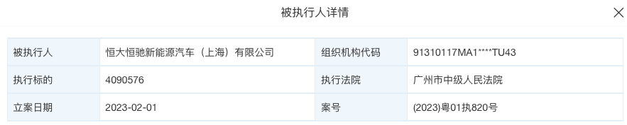 2月1日,恒大恒驰新能源汽车(上海)有限公司新增一则被执行人信息,执行标的409万余元,执行法院为广州市中级人民法院。截至目前该公司已累计被执行超2.8亿元。