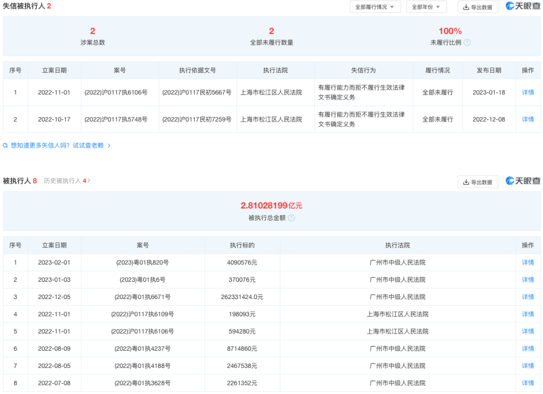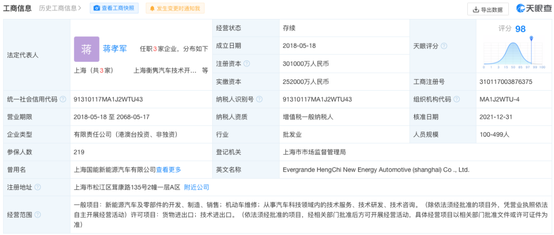 天眼查信息显示,截至发稿前,恒大恒驰新能源汽车(上海)有限公司自身风险信息为131条,限制消费令3条,终本案件执行标的总金额401.844万元,未履行总金额401.844万元,未履行比例100%;失信被执行人涉案总数2条;与此同时,恒大恒驰新能源汽车(上海)有限公司被广州、上海人民法院列为被执行人,累计被执行金额超2.8亿元。