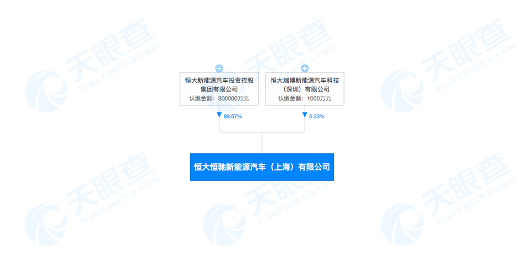 恒大恒驰新能源汽车(上海)有限公司成立于2018年5月,法定代表人为蒋孝军,注册资本为301000万人民币,经营范围包括新能源汽车及零部件的开发、制造、销售等。股权穿透图显示,恒大恒驰新能源汽车(上海)有限公司由恒大新能源汽车投资控股集团有限公司和恒大瑞博新能源汽车科技(深圳)有限公司共同持股,双方分别持股99.67%和0.33%。