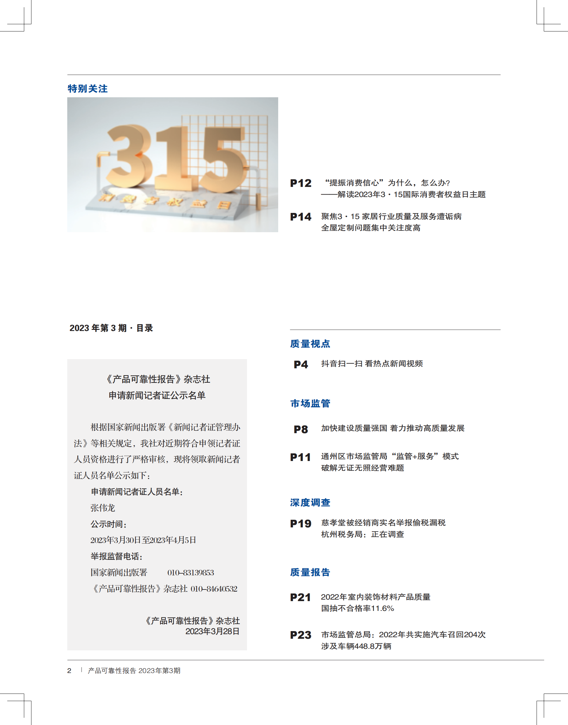 本期热点:加快建设质量强国 着力推动高质量发展;“提振消费信心”为什么,怎么办?——解读2023年3·15国际消费者权益日主题;家居行业质量及服务遭诟病 全屋定制问题集中关注度高;2022年室内装饰材料产品质量国抽不合格率11.6%;2022年共实施汽车召回204次 涉及车辆448.8万辆;探析新时代从汽车产销大国到“汽车制造强国”的发展策略。