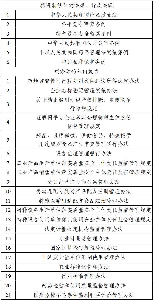 近日,市场监管总局部署2023年度重点立法任务,加强市场监管法治建设。今年总局立法工作坚持以习近平新时代中国特色社会主义思想为指导,围绕落实党的二十大作出的重大决策部署,坚持稳中求进工作总基调,大力推进基础制度的创新供给,更好发挥法治固根本、稳预期、利长远的保障作用。 在确定重点立法任务时,总局结合市场监管新形势、新任务,服从和服务于市场监管事业发展全局,区分轻重缓急,重点围绕四个方面作出部署:一是深入实施公平竞争政策,不断优化公平竞争环境,积极推动《公平竞争审查条例》的制定,修订《关于禁止滥用知识产权排除、限制竞争行为的规定》等规章。二是持续推进市场准入准营退出便利化,不断优化营商环境,切实提升平台经济常态化监管水平,制修订《企业名称登记管理实施办法》《互联网平台企业落实合规管理主体责任监督管理规定》《药品、医疗器械、保健食品、特殊医学用途配方食品广告审查管理暂行办法》等规章。三是严格落实“三品一特”安全责任,进一步强化市场监管领域安全保障,积极推动《特种设备安全监察条例》《药品管理法实施条例》《中药品种保护条例》等行政法规的修订,制修订《食品经营许可和备案管理办法》《设备监理管理暂行办法》《特种设备生产单位落实质量安全主体责任监督管理规定》《药品经营和使用质量监督管理办法》等规章。四是充分发挥质量支撑作用,加快推进质量强国建设,积极推动《产品质量法》《认证认可条例》的修订,修订《国家计量检定规程管理办法》《行业标准管理办法》等规章。 在推进各项重点立法任务中,总局将严格按照《立法法》《行政法规制定程序条例》《规章制定程序条例》等规定,深入推进科学立法、民主立法、依法立法,着力提高立法质量和效率,不断增强立法系统性、整体性、协同性、时效性,推动形成系统完备、科学规范、运行有效的市场监管法律规范体系。