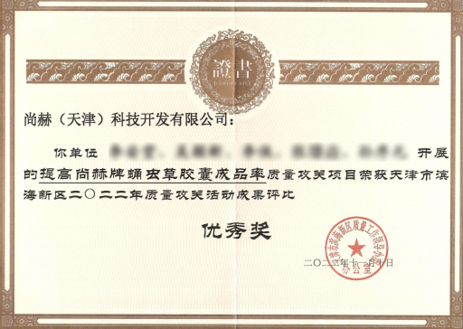 尚赫公司CEO陈旻君与研发团队探讨产品 以科技创新品,以质量创效益 日前,天津市滨海新区质量工作领导小组办公室发布信息,尚赫公司荣获 “天津市滨海新区质量攻关活动成果评比优秀奖”,尚赫研发团队以“提高蛹虫草胶囊成品率”作为质量攻关课题,进一步提升质量、精进工艺,为市场及消费者提供优质的产品。