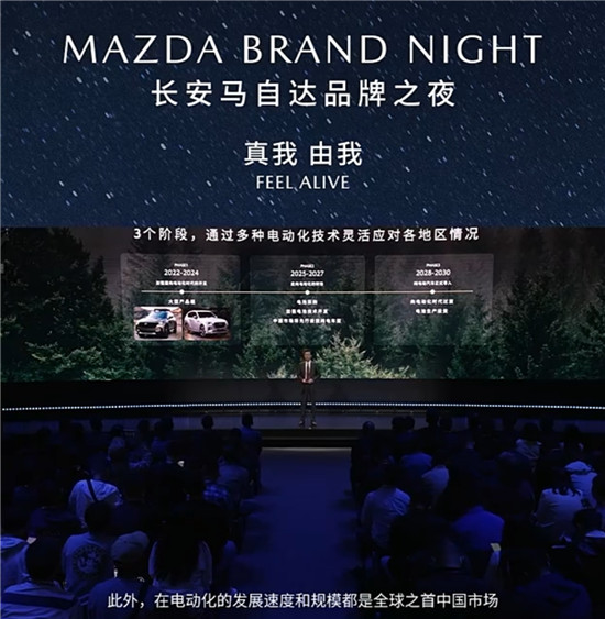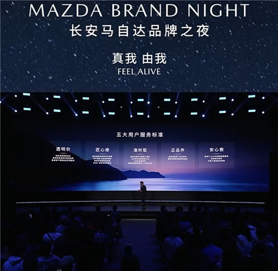 直播截图 为继续提升用户服务体验,长安马自达正式发布透明价、匠心修、准时取、正品件、安心救五大服务标准。此外,在数字化3.0阶段,长安马自达要打造以用户体验触点为核心的数字化能力,以“直达客户、直击痛点、数据驱动、实时在线”为发展思路,围绕产品全生命周期体验旅程,合理运用数字化工具,构建起以“长安马自达·经销商·客户”为核心的“三位一体”数字化服务链路。 今年,长安马自达还将在终端建立“1+X”模式的客户专属车辆管家群:一位用户,要匹配包括销售顾问、产品经理、售后服务顾问、紧急救援人员、客户关怀人员,甚至是店总等多人组成的专属管家服务,为用户提供快捷、周到、真诚的服务体验。 在本次品牌之夜,马自达汽车正式发布了全新的品牌主张——真我 由我 FEEL ALIVE!马自达将新的全球品牌主张在中国本土化落地,正是洞悉了中国消费者追求悦己体验的需求。而全新品牌主张的到来,也意味着长安马自达在瞬息万变的中国车市中,进一步推进“以用户体验”为导向的全新战略正式开启。
