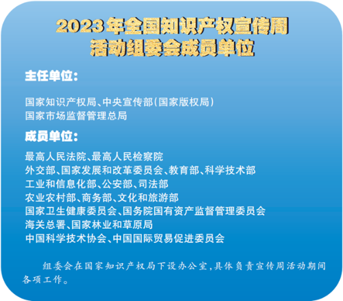 2023年全国知识产权宣传周活动近日启幕,并持续至4月26日——第23个世界知识产权日。北京主会场和辽宁省、江苏省、湖北省、新疆维吾尔自治区、广州市5个分会场以线上线下结合方式举行,拉开全国活动的帷幕。 今年宣传周活动的主题是“加强知识产权法治保障 有力支持全面创新”,由国家知识产权局、中央宣传部(国家版权局)、国家市场监督管理总局三部门牵头,会同最高人民法院、最高人民检察院等18家部门单位共同举办,其中,中国国际贸易促进委员会首次成为组委会成员单位。 党的二十大报告强调“加强知识产权法治保障,形成支持全面创新的基础制度”,这是对知识产权工作提出的明确要求,是对知识产权事业发展作出的重要部署。2023年是全面贯彻落实党的二十大精神的开局之年,也是实施《知识产权强国建设纲要(2021—2035年)》和《“十四五”国家知识产权保护和运用规划》承上启下的重要一年。今年的宣传周活动是知识产权领域学习宣传贯彻党的二十大精神,积极推进知识产权强国建设的重要举措。活动组委会主任单位与成员单位将在第23个世界知识产权日来临之际,共同加强知识产权保护宣传教育,深入推进以“尊重知识、崇尚创新、诚信守法、公平竞争”为核心的知识产权文化建设。 据介绍,今年的宣传周活动中,各地方、各部门将重点做好五方面宣传:深入宣传贯彻习近平新时代中国特色社会主义思想,特别是习近平总书记关于知识产权工作的重要指示论述;全面宣传贯彻党的二十大、二十届二中全会精神和2023年全国两会精神;持续宣传知识产权强国建设纲要和“十四五”知识产权规划一体推进贯彻落实情况;系统宣传新时代十年中国知识产权事业发展取得的历史性成就、发生的历史性变革;广泛宣传知识产权工作以人民为中心、服务人民群众美好生活的生动实践。 此外,今年是中国与世界知识产权组织(WIPO)合作50周年,宣传周活动将与相关纪念活动联动展开,进一步扩大知识产权对内对外宣传效果,提升宣传周活动的国际影响力、传播力。宣传周活动期间,全国各地将开展数千场特色活动,推动知识产权文化宣传进机关、进企业、进社区、进校园,走进社会公众日常生活。 《关于开展2023年全国知识产权宣传周活动的通知》进一步要求,各地区各部门面向创新主体、机关工作人员、青少年及社会公众等不同群体,采取线上线下多样化方式,积极稳妥、安全有序地开展知识产权宣传。增强全社会尊重和保护知识产权意识,为立足新发展阶段、贯彻新发展理念、构建新发展格局,推动高质量发展营造良好舆论氛围。 |