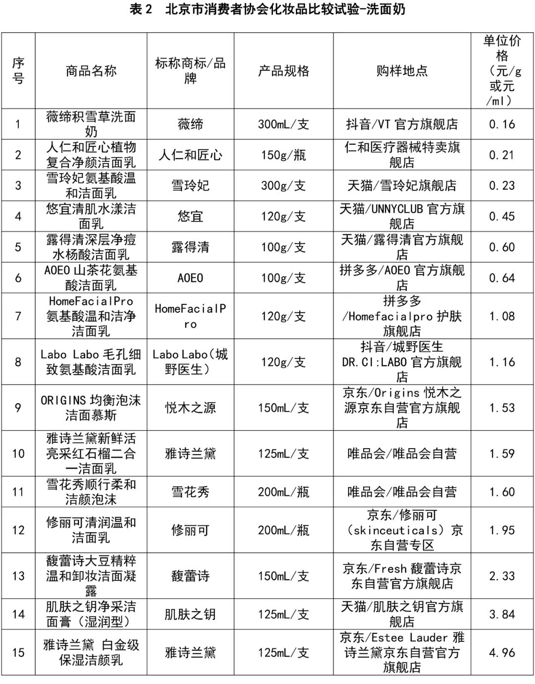 2、洗面奶 本次比较实验共选取了15款洗面奶,本次样品购买覆盖了国产产品和进口产品,国产7批次,进口8批次,从价格来看覆盖高中低3档,单位价格(元/g或元/ml)<1元共6款,1-2元共7款,2-10元共3款。 经过备案信息核查、标签核查(2022年5月1号后备案的产品)的合规性审查,以及重金属(铅砷汞镉)、急性眼刺激、二噁烷、pH相关项目的检验。检验结果均符合国家相关要求。 经过综合比较,大部分国产产品的性价比较高。单位价格在1元/g以下的有6款,分别为薇缔积雪草洗面奶、人仁和匠心植物复合净颜洁面乳、雪玲妃氨基酸温和洁面乳、悠宜清肌水漾洁面乳、露得清深层净痘水杨酸洁面乳、AOEO山茶花氨基酸洁面乳。