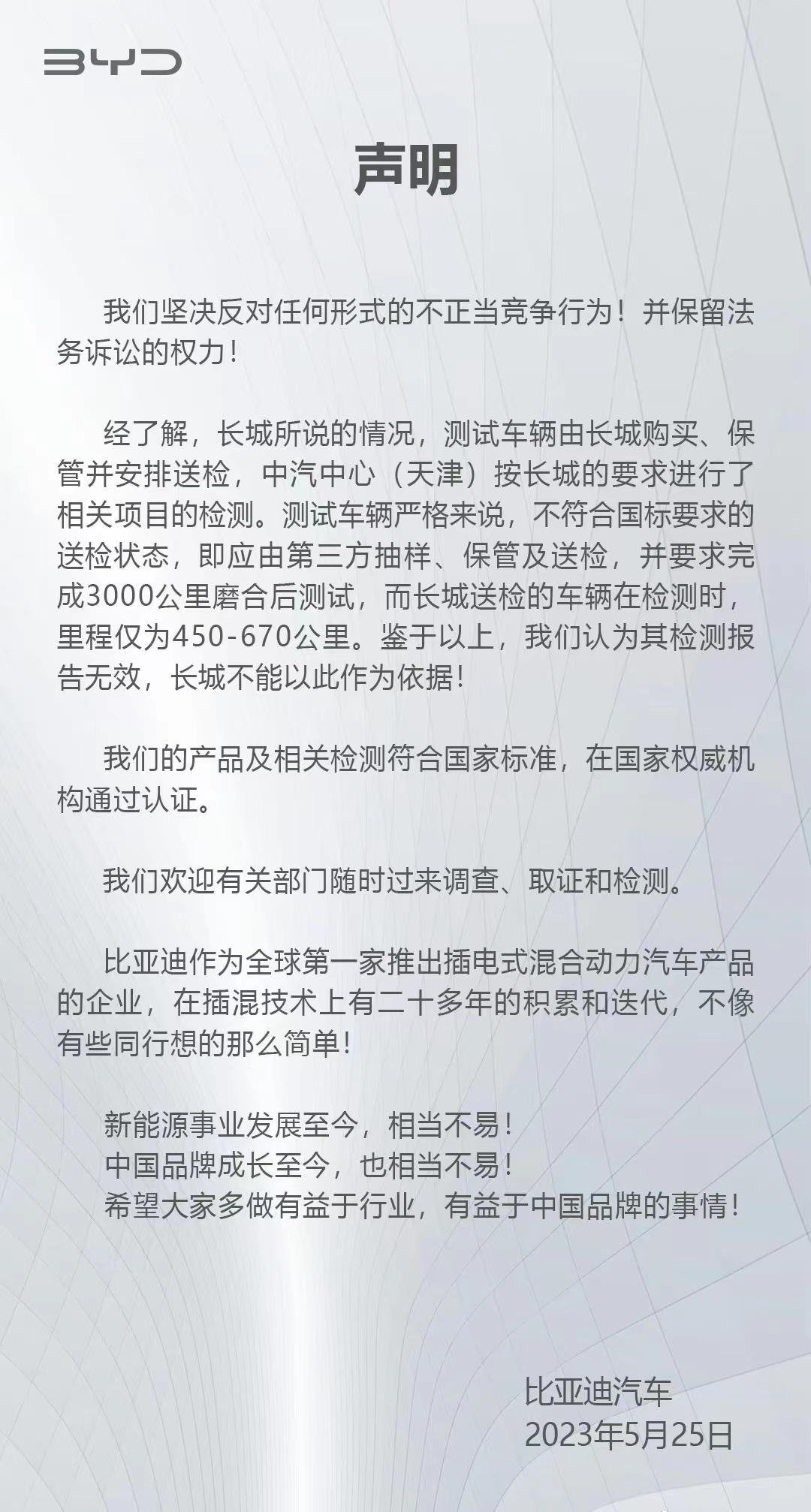 长城举报比亚迪,比亚迪正面回应!
