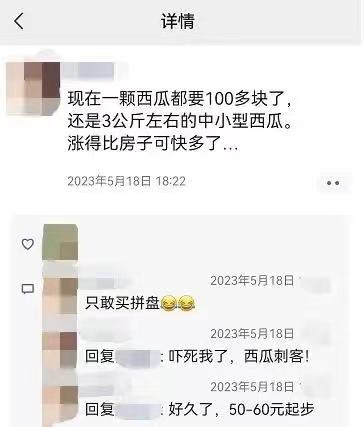 还有的网友发朋友圈,说现在一颗西瓜都要100多块了,还是3公斤左右的中小型西瓜!
