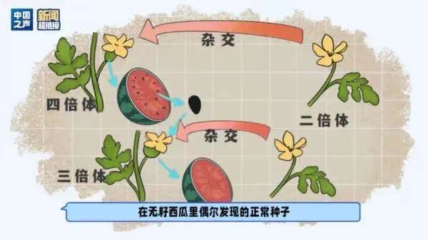 此外,无籽西瓜是用自然的二倍体西瓜和经过诱变产生的四倍体西瓜杂交而来的,而在无籽西瓜里偶尔发现的正常种子,是1/1024几率出现的“幸运儿”.
